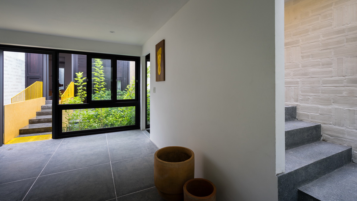 Communications of the house is very clear but also full of interesting and special feelings. Architects have set two bridges as transport links throughout the blocks, one bridge made of concrete, sloping connects the master bedroom and work room at the 2nd floor, a yellow steel bridge to connect the Altar room with the external garden, and its point is a blank space on the front facade. It characterizes the old tube houses of Hanoi's ancient streets. The roof folds were gently reproduced as in “Pho Phai” paintings.