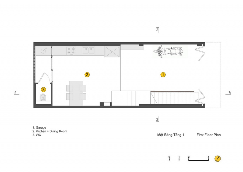 Tại tầng 1 các không gian được sắp xếp liên hoàn, vay mượn, các diện tích lẫn nhau tạo ra sự tối đa về diện tích khi sử dụng. Tại tầng 4 là một tổ hợp chức năng: Phòng chơi, một phòng thờ, một phòng giặt phơi, một vườn nhỏ và một khoảng thủng của mái tiếp xúc trực tiếp với thiên nhiên, với nhiều chức năng sử dụng như vậy trong diện tích khoảng 40m2 nên chúng tôi đã tận dụng các giải pháp thiết kế và sử dụng vật liệu làm cho các không gian “tan biến” vào nhau trong khi nó hoàn toàn được ngăn cách. Các nguồn sáng được trực tiếp hoặc gián tiếp này được cộng hưởng lẫn nhau giúp cho một ngôi nhà không có thông tầng vẫn có ánh sáng ở phần giữa ngôi nhà. Vật liệu sắt gỉ như một thứ chủ đạo với các chi tiết được cắt Laser theo kiểu Type grap.