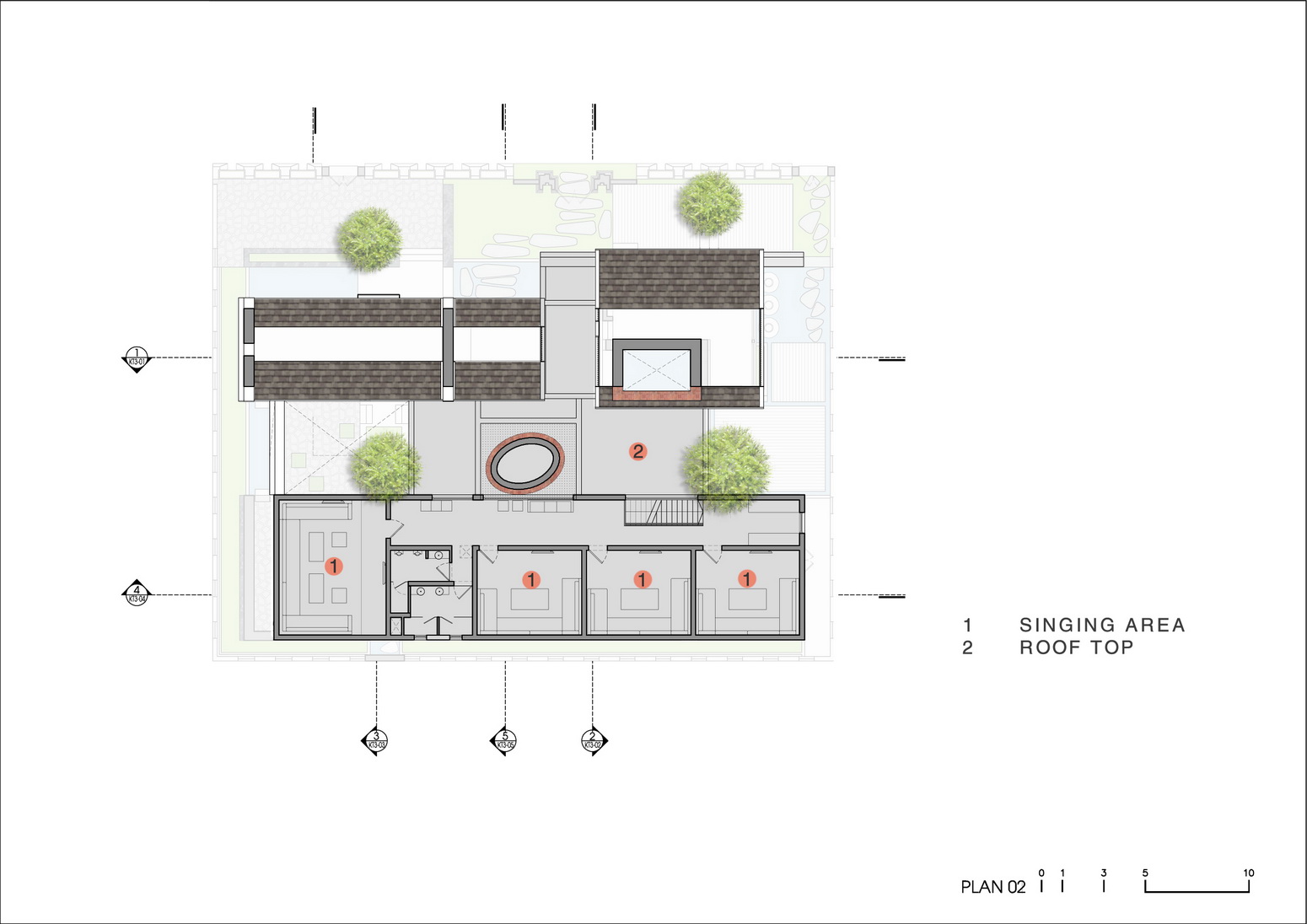 A 700-metre-square plot located in one urban area and the owner is a youth. Behind the wheels of hurried life, it is time for him to contemplate what he needs ... He wants a eminently-local and indigenous-nuances space. The project is located in Vietnam's ancient capital - Ninh Binh province where religion is diverse and complex, especially there is a parallel existence, even mix, of Buddhist and Christian (the West and the East). Faced an urban with complex architectures style, we are actuated to approach the design in terms of "nation" and “local identity” which we define as a cultural space. The place is for communicating, thinking of past, and also conducting business.